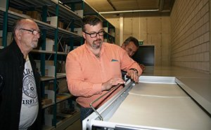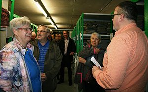 „Ein Meter Papier wiegt etwa 28 Kilogramm“, erklärt Peter Halicska den Teilnehmern des Handwerkergesprächs die besonderen Anforderungen, die an das Gebäude gestellt werden. „In jeder Decke sind deshalb 175 Tonnen Stahl verbaut. Die Bodenplatte könnte ein elfstöckiges Hochhaus tragen.“ Der wichtigste Faktor bei der Archivierung von Dokumenten sei jedoch die Klimatisierung, wie Halicska erläutert. Die Lufttemperatur müsse gleichermaßen wie die Luftfeuchtigkeit konstant sein. Ideale Lagerbedingungen – 16 bis 20 °C und 45 bis 55 Prozent Feuchtigkeit – werden durch einen komplexen Wandaufbau auf ganz natürliche Weise möglich. Die Vielfalt der umfangreichen Archivbestände machte der Archivamtsrat anhand einzelner Vorzeigeobjekte deutlich. Eine große, mehrere Kilo schwere Musikhandschrift aus der vorreformatorischen Zeit – in Leder gebunden und mit schlichten Messingbeschlägen verziert – beeindruckte dabei besonders.