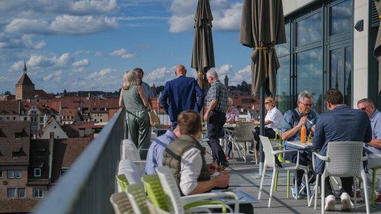 Bild links:Teilnehmer im Gespräch beim Get-Together auf der Dachterrasse der AOK Mittelfranken