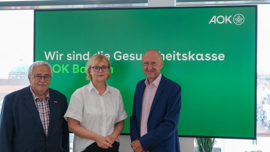 Bild rechts: Kreishandwerksmeister Achim Hanisch, die Geschäftsführerin der KHW Manuela Wohlert sowie der Gastgeber und Direktor der AOK Mittelfranken Horst Leitner auf der Jahreshauptversammlung (v.l.n.r.)