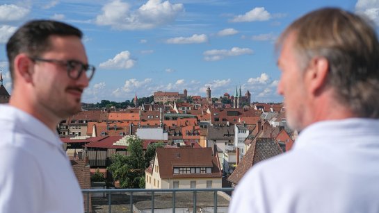 Bild links:Teilnehmer im Gespräch beim Get-Together auf der Dachterrasse der AOK Mittelfranken
