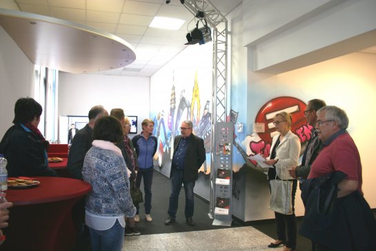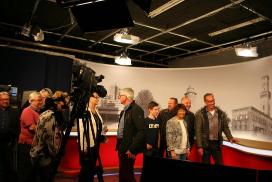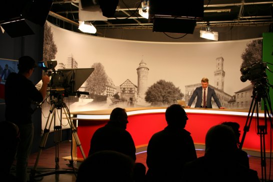 Das Handwerkergespräch der Kreishandwerkerschaft (KHW) Nürnberg Stadt und Land ermöglichte den Teilnehmern dieses Mal einen Blick hinter die Kulissen des Franken Fernsehens. Claudia Grande und Rainer Skodda, Sales Manager bei TVF Fernsehen in Franken, erzählten über die Geschichte und führten die Gäste durch die Redaktion des Lokalsenders, der vor 25 Jahren zum ersten Mal auf Sendung ging. Mit Einblicken in die Maske, den Schnitt und die Regie ging es dann direkt ins Studio. Als Highlight konnten die Teilnehmer live bei der Aufzeichnung der Nachrichtensendung „Guten Abend Franken“ mit dabei sein. Nachdem die Kameras richtig eingestellt und die Teleprompter-Texte auf den neuesten Stand gebracht wurden, beginnt der Dreh. Die Moderatoren Adrian Roser und Corinna Kleinekoenen stimmen sich in den Werbepausen und Beiträgen immer wieder mit der Regie ab, denn die Sendung muss auf die Sekunde genau 30 Minuten lang sein. Im Anschluss an die Aufzeichnung stand Moderator Adrian Roser den interessierten Studiogästen noch Rede und Antwort.