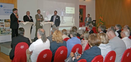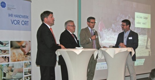 In einer anschließenden Talkrunde stellten sich Kreishandwerksmeister Achim Hanisch, Wirtschaftsreferent Dr. Michael Fraas, Dirk Helmbrecht und Klaus Scherer den Fragen von Moderator Klaus Schardt, Geschäftsführer der Agentur KONTEXT public relations. Dabei ging es um das Leitthema Amerika und die Auswirkungen der dortigen Politik auf die hiesige Wirtschaft gleichermaßen wie um die aktuellen Herausforderungen, mit denen sich das Handwerk in der Region konfrontiert sieht. So beispielsweise mit dem drohenden Fachkräftemangel, der einerseits durch den demografischen Wandel und die damit einhergehenden rückläufigen Schülerzahlen, andererseits durch den Trend zur akademischen Laufbahn begründet ist. Zu schaffen machen den Betrieben auch die mangelnde Flexibilität der Arbeit und die als ungenügend empfundene Förderung des Handwerks.